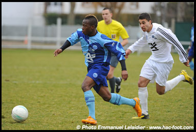 Le sport de haut niveau est souvent cruel... Les Havrais en ont fait la triste expérience aujourd'hui, à Moulin, lors de la première journée de la phase finale du Championnat de France. Au dessus de l'OL dans le jeu, les jeunes Normands ont pêché dans la finition, et ont cruellement manqué de réussite. Au terme de la première période (qui dure 35 minutes, rappelons-le), les partenaires de Drissa Traoré (en photo ci-contre) pouvaient déjà regretter de ne pas être devant au score. En effet, Boketsu cognait le poteau d'entrée (3ème), avant que Thiam ne perde son duel avec le gardien lyonnais quelques minutes plus tard (11ème). Les Lyonnais, eux, rivalisaient par instant, mais se montraient nettement moins menaçants que les « Ciel et Marine ». Et sur leur plus grosse occasion, consécutive à une énorme mésentente entre Boucher et Koulibaly, les Olympiens trouvaient l'ouverture (0-1, 48ème). Il en fallait néanmoins plus pour démoraliser les Normands qui repartaient à l'attaque. Mais la chance fuyait encore quand Traoré touchait les deux montants d'une même tentative (58ème). Les dix dernières minutes ne suffisaient pas aux hommes de François Rodrigues pour combler leur retard...