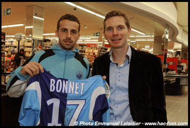 Le milieu de terrain Alexandre Bonnet a reçu le trophée du HACMAN du mois de novembre 2010 de la part d'Alexandre Lecouffe (Super U Océane)…