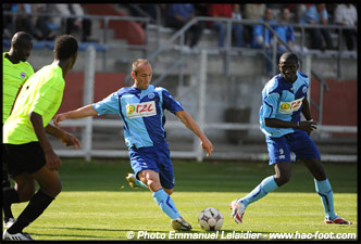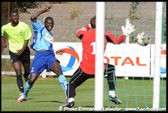 « Dona » n'a pas encore marqué, mais sa puissance met le Stade Malherbe au supplice. Sur un bon centre de Bouadla, l'attaquant camerounais place une reprise osée du pied gauche qui frôle le poteau droit de Perquis (34ème). Il n'attend néanmoins pas longtemps avant de forcer la décision. Après un débordement éclair que l'on aimerait revoir en L2 signé Davidas, Laurant reprend de la tête mais est contré. Dona N'Doh, malgré un angle très fermé (photo ci-dessous), parvient à redonner deux buts d'avance au HAC, en puissance (3-1, 38ème).