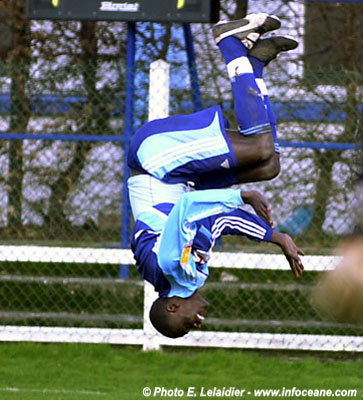 Les Havrais reviennent en seconde période avec des intentions bien meilleures et cela ne tarde pas à porter ces fruits, comme en première mi-temps c'est d'entrée de jeu que les Ciel & Marine font la différence, Benjamin Laurant déborde sur la gauche centre pour Ande Dona Ndoh qui décroche une frappe croisée imparable, et de deux pour le jeune attaquant havrais qui gratifie le public d'une succéssion de sauts périlleux (photo ci-contre).