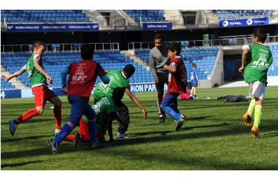 250 enfants des 4 territoires concernés par l’opération se sont retrouvés la pelouse du stade pour participer à un festi foot : Le matin pour les 8-9 ans et l’après midi pour les 10-12 ans. Les enfants sont arrivés en bus, grâce au partenariat avec la LIA, et des chauffeurs volontaires qui, pendant toute l’opération, ont permis aux enfants de se déplacer pour assister aux entraînements, aux festi-foot et au match HAC Arles le vendredi 16 mai, dans le cadre de l’opération « un parent – un enfant » parrainée par la VDH.