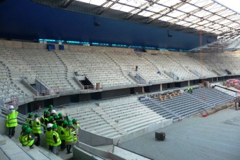 Ensuite nous avons monté des marches et nous sommes arrivés au cœur du stade dans les tribunes. Il y a cinq niveaux de tribunes. Le stade pourra accueillir 25 000 spectateurs.