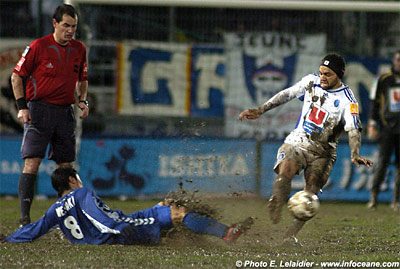 Les minutes passent et la tension monte. Grenoble tente une poussée. Le HAC tient bon mais serait bien inspiré de doubler la mise. Côté terrain la boue a depuis trop longtemps remplacé ce qui pouvait rester de pelouse. Pour les joueurs, il est impossible pratiquer le football. Le ballon est systématiquement ralenti. Il reste 12’ dans le temps réglementaire. Traoré est à deux doigts d’être à la réception d’un centre de Anin. Sur le corner, Traoré reprend mais trop mollement.