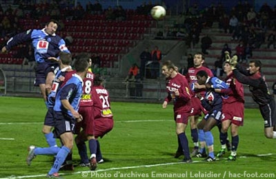 A la 81', dans une ambiance de plus en plus glaciale le HAC obtient un coup franc. Lesage le tire et dépose le ballon sur la tête de Ciechelski (photo ci-contre) qui trompe Assemoassa. (1-1), visiblement cela ne contente pas les supporters. A la 86', Clermont foot se crée une énorme occasion. Montéro s'échappe et se retrouve seul face à Vencel qui sauve son équipe du naufrage en détournant le ballon du bout du pied.