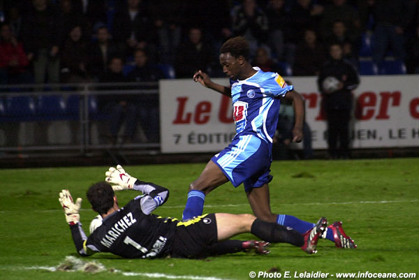 Cela n’entame pas la motivation Ciel et Marine et à la 73’, le stade va se lever lorsque Alassane, servi par Lesage rentre dans la surface et il est bousculé par Marichez (photo ci-contre). Monsieur Grégoire indique le point de penalty. Lesage prend ses responsabilités. Le gaucher marque mais l’arbitre le fait retirer. Jean-Michel garde son sang-froid et pour sa deuxième tentative, marque de nouveau. C’est une énorme explosion de joie dans le stade. Ce but n’est que justice tant les Havrais dominent cette rencontre. Lorsque Thierry Uvenard décide de remplacer Alassane, tout le stade est debout pour ovationner celui qui jouait en DHR il y a encore quelques mois et qui ce soir, a illuminé le vieux stade.