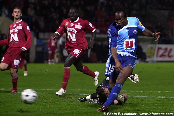 C’est tellement ce qu’ils vont faire qu’à la 59’, Traoré bénéficie au départ d’une « boulette » de Carotti. Ce qui va suivre va être du grand art. Kandia fixe Pionnier, le contourne et glisse le ballon au fond des filets. (2-0) cette fois, on va pouvoir respirer plus tranquillement d’autant que ce n’est pas fini puisque à la 66’ Montpellier va totalement sombrer lorsque Lesage offre un caviar à Milambo-Mutamba qui expédie un boulet de canon de la tête qui ne laisse aucune chance à Pionnier (photo ci-contre). Le public revît. Son équipe a retrouvé l’efficacité. Le HAC n’a plus qu’à contrôler, peut-être en marquer un quatrième ce que tente Devaux à la 83’ d’un tir qui passe juste au-dessus de la transversale.