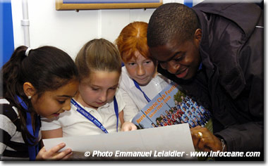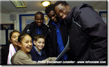 Pour conclure cette après-midi d’échange, un dernier groupe de 3 joueurs est allé rencontrer en fin de journée un groupe d’enfant et de leurs éducateurs. Cette fois, ce sont Valéry Mezague, Cheikh Oumar Dabo et Mahamadou Cissé qui, dans un anglais parfait se sont prêté au jeu des questions-réponses avec les enfants. On y apprend par exemple que Mahamadou Cissé aimerait beaucoup jouer un jour à Liverpool ou que le club anglais préféré de Cheikh Oumar Dabo est Arsenal ! À la fin de cette rencontre distribution de petits souvenirs aux couleurs Ciel & Marine et une démonstration de jonglage des 3 Havrais pour le plus grand plaisir des enfants.